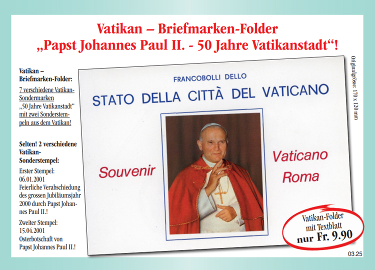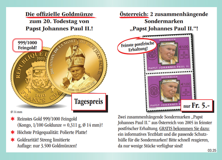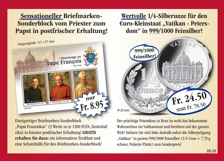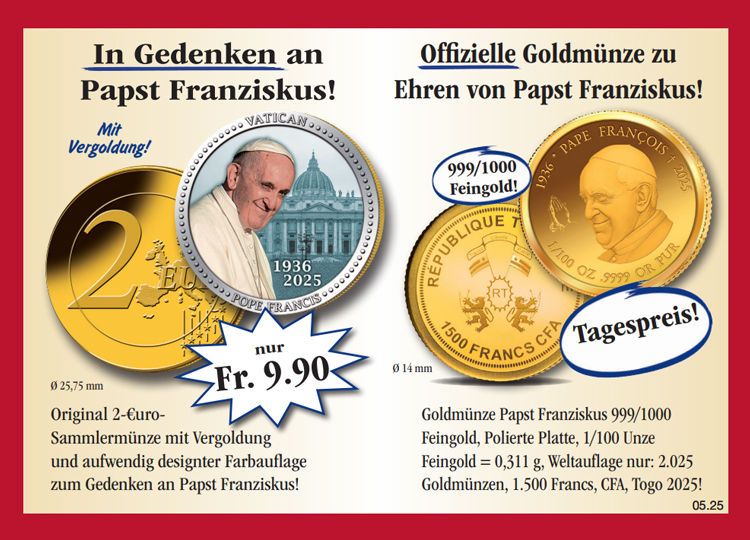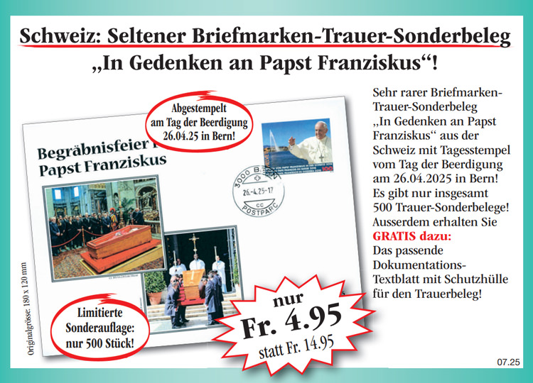 Warenkorb Sie haben bisher keine Artikel in Ihrem Warenkorb. Der seltene Briefmarken-Trauer-Sonderbeleg „In Gedenken an Papst Franziskus“ in feinster postfrischer Erhaltung aus der Schweiz! Sichern Sie sich noch heute den postfrischen Briefmarken-Trauer-Sonderbeleg „In Gedenken an Papst Franziskus“ mit Tagesstempel vom Tag der Beerdigung am 26.04.2025 in Bern inkl. dem passenden Dokumentations-Textblatt mit Schutzhülle für den Trauerbeleg zum Sonderpreis von nur Fr. 4.95 statt Fr. 14.95 und monatlich weitere Ausgaben aus dieser Sammlung unverbindlich und ohne Kaufverpflichtung zur Ansicht. Sie haben bei jeder Lieferung ein 14-tägiges Rückgaberecht! statt Fr. 14.95 Fr. 4.95 inkl. gesetzlicher MwSt. Menge: zzgl. anteilige Versandkosten (Porto, Verpackung, Versicherung) Dieses Produkt kann nur 5 Mal pro Kunde bestellt werden. Bei Fragen wenden Sie sich bitte an unseren Kundenservice. Ist das auch interessant für Sie?