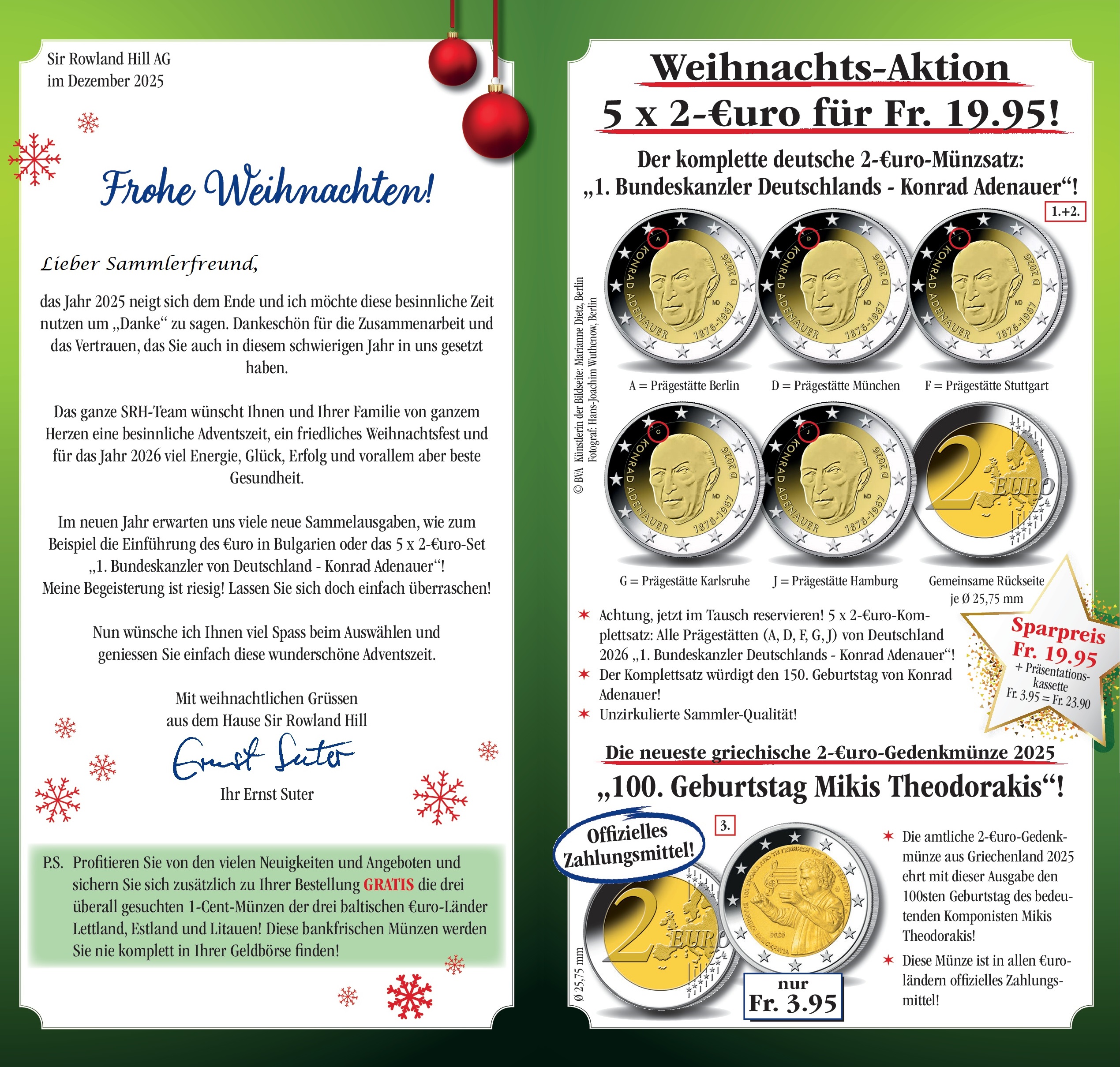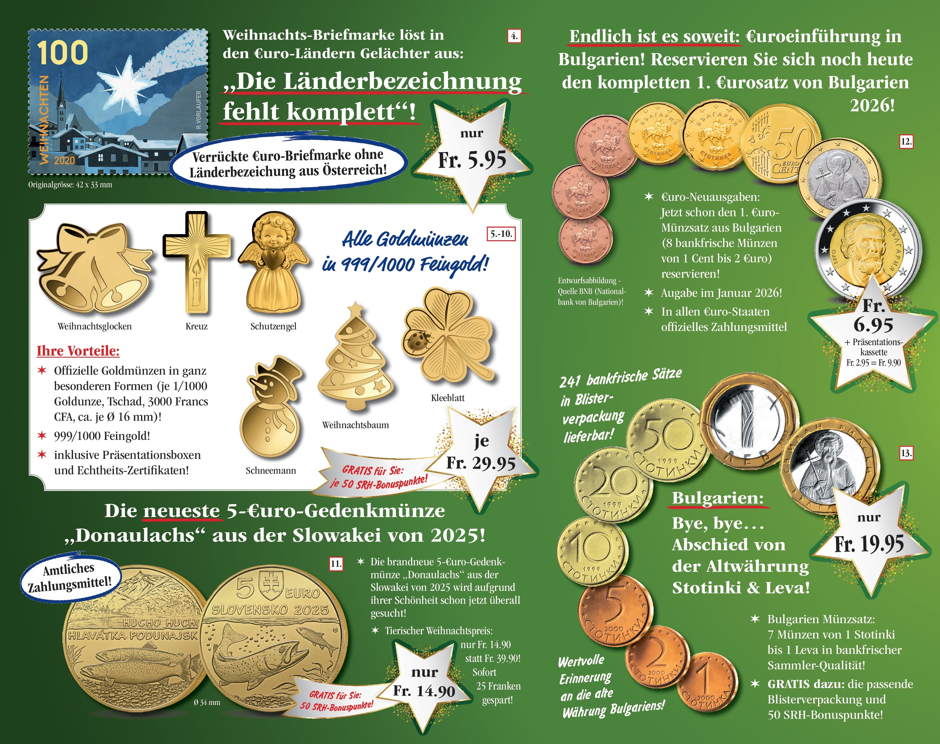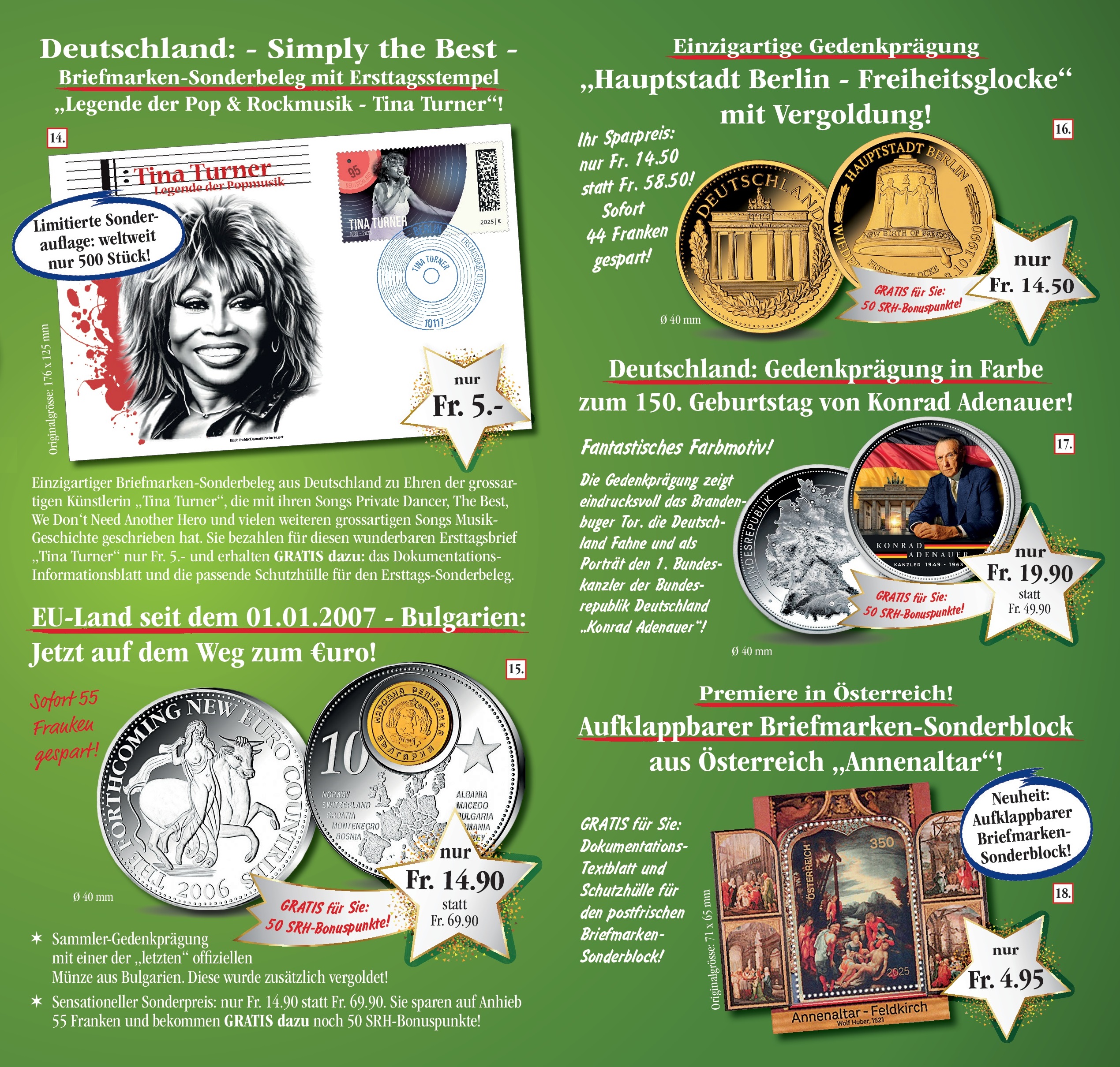 Vertrauens-Garantie/Widerrufsrecht: Ohne Angaben von Gründen können Sie Ihren Auftrag innerhalb von 14 Tagen widerrufen. Eine kurze Nachricht oder Rücksendung der Ware an SRH genügt. Sie tragen die unmittelbaren Kosten für die Rücksendung an Sir Rowland Hill AG, Schützenmattstrasse 46, 8180 Bülach ZH. Es gelten unsere AGB, die Sie unter www.srh-ltd.ch einsehen oder schriftlich bei uns anfordern können. Datenschutz-Hinweis: Die Verwendung Ihrer personenbezogenen Daten für Werbung erfolgt vertraulich und nur von SRH. Der Widerruf ist jederzeit möglich: Per Post an SRH oder E-Mail an datenschutz@srh-ltd.ch