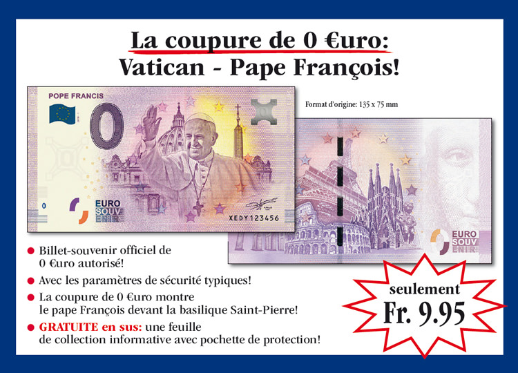 Panier Vous n'avez pas encore d'article dans votre panier. La coupure de 0 euro: Vatican – Pape François! Assurez-vous dès aujourd'hui la coupure de 0 euro officiellement autorisée „Vatican – Pape François“ avec une feuille de collection informative et une pochette de protection incluses pour seulement Fr. 9.95 et recevez à rythme mensuel d'autres émissions de cette collection, à l'examen et sans obligation d'achat. A chaque livraison, vous disposez d'un droit de restitution de 15 jours! Fr. 9.95 TVA légale incluse Quantité: Participation aux frais d'envoi en sus (port, emballage, assurance) Ce produit ne peut être commandé que 5 fois par client. En cas de question, contactez notre service clientèle.