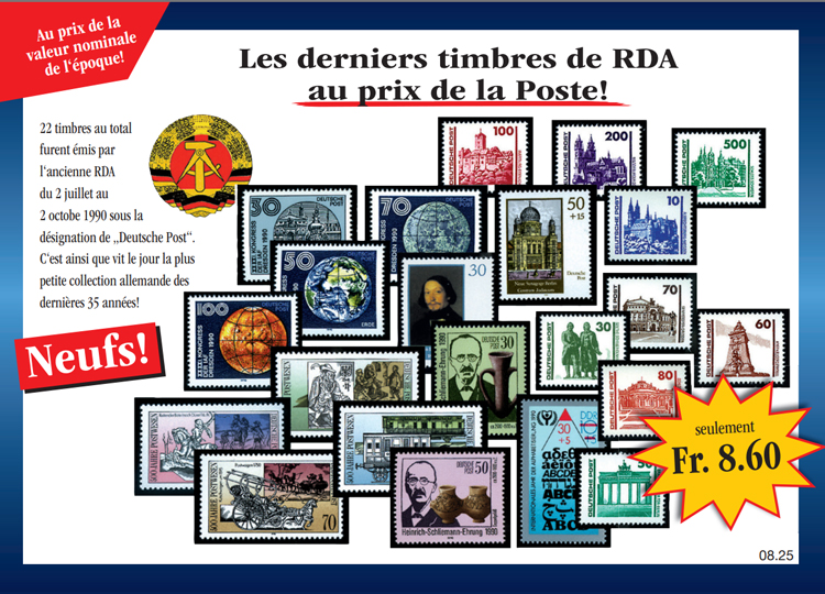 Panier Vous n'avez pas encore d'article dans votre panier. Les derniers 22 timbres-poste de la RDA de 1990! Procurez-vous dès aujourd'hui les derniers 22 timbres-poste de la RDA de 1990, émis entre le 2 juillet et le 2 octobre 1990 sous le nom de „Deutsche Post“, au prix postal de seulement Fr. 8.60 au lieu du prix-catalogue de Fr. 20.- et recevez à rythme mensuel une autre émission de cette collection à l'examen et sans obligation d'achat. A chaque livraison, vous disposez d'un droit de restitution de 15 jours! au lieu de Fr. 20.00 Fr. 8.60 TVA légale incluse Quantité: Participation aux frais d'envoi en sus (port, emballage, assurance) Ce produit ne peut être commandé que 5 fois par client. En cas de question, contactez notre service clientèle.