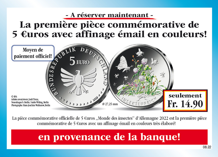 Panier Vous n'avez pas encore d'article dans votre panier. La première pièce commémorative allemande de 5 euros avec affinage en couleurs „Monde des insectes“ de 2022! Procurez-vous dès aujourd'hui la première pièce commémorative allemande de 5 euros avec précieux affinage en couleurs „Monde des insectes“ de 2022 au prix spécial de seulement Fr. 14.90 et recevez à rythme mensuel une autre émission de cette collection à l'examen et sans obligation d'achat. A chaque livraison, vous disposez d'un droit de restitution de 15 jours! Fr. 14.90 TVA légale incluse Quantité: Participation aux frais d'envoi en sus (port, emballage, assurance) Ce produit ne peut être commandé que 5 fois par client. En cas de question, contactez notre service clientèle. Cela pourrait aussi vous intéresser!