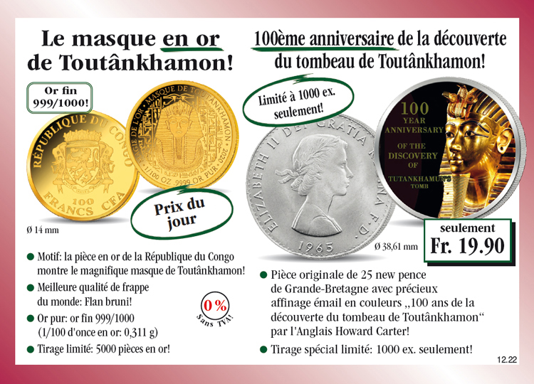 Panier Vous n'avez pas encore d'article dans votre panier. La pièce en or rare „Le masque de Toutânkhamon“ de 2020! Procurez-vous dès aujourd'hui la pièce en or rare „Le masque de Toutânkhamon“ de 2020 (or fin 999/1000, Flan bruni, 14 mm, 1/100 d'once = 0,311 g, République du Congo) au prix du jour de seulement Fr. 79.90 et recevez à rythme mensuel une autre émission de cette collection, à l'examen et sans obligation d'achat. A chaque livraison, vous disposez d'un droit de restitution de 15 jours! Fr. 79.90 TVA légale incluse Quantité: Participation aux frais d'envoi en sus (port, emballage, assurance) Ce produit ne peut être commandé que 5 fois par client. En cas de question, contactez notre service clientèle. La pièce originale de 25 new pence avec affinage émail en couleurs „100ème anniversaire de la découverte du tombeau de Toutânkhamon“! Procurez-vous dès aujourd'hui la pièce originale de 25 new pence avec précieux affinage émail en couleurs „100ème anniversaire de la découverte du tombeau de Toutânkhamon“ au prix spécial de seulement Fr. 19.90! A chaque livraison, vous disposez d'un droit de restitution de 15 jours! Fr. 19.90 TVA légale incluse Quantité: Participation aux frais d'envoi en sus (port, emballage, assurance) Ce produit ne peut être commandé que 5 fois par client. En cas de question, contactez notre service clientèle. Cela pourrait aussi vous intéresser!