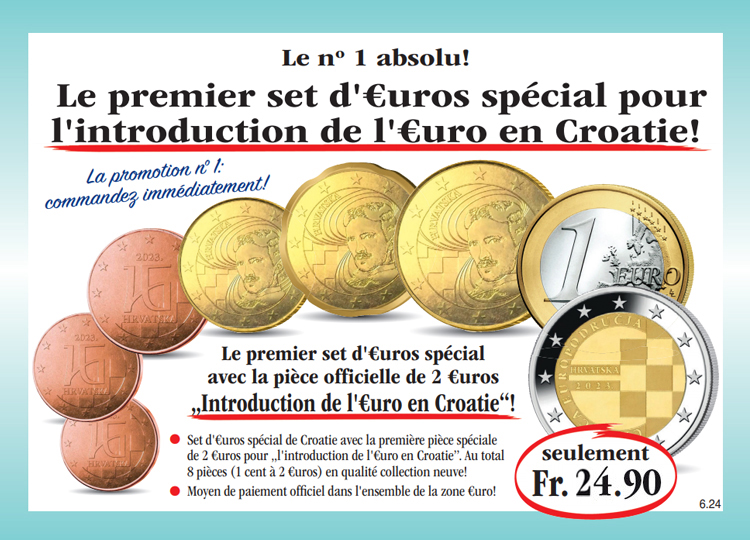 Panier Vous n'avez pas encore d'article dans votre panier. Le premier set d'euros spécial pour l'introduction de l'euro en Croatie! Procurez-vous dès aujourd'hui le premier set d'euros spécial Croatie (8 pièces: 1 cent à 2 euros) avec incluse la pièce spéciale de 2 euros de 2023 „Introduction de l'euro en Croatie“ au prix spécial de seulement Fr. 24.90 et recevez à rythme mensuel une autre émission de cette collection à l'examen et sans obligation d'achat. A chaque livraison, vous disposez d'un droit de restitution de 15 jours! Fr. 24.90 TVA légale incluse Quantité: Participation aux frais d'envoi en sus (port, emballage, assurance) Ce produit ne peut être commandé que 5 fois par client. En cas de question, contactez notre service clientèle. Cela pourrait aussi vous intéresser!