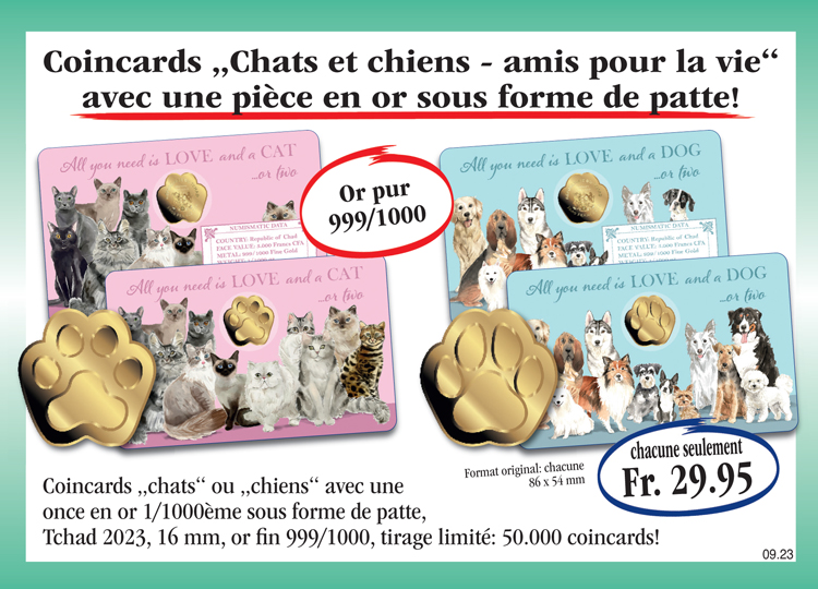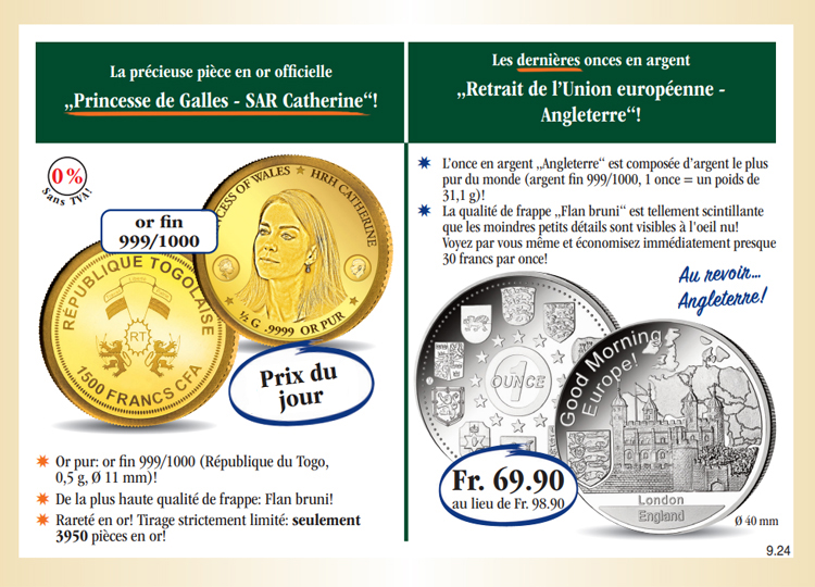 Panier Vous n'avez pas encore d'article dans votre panier. La somptueuse pièce en or officielle „Princesse de Galles – SAR Catherine“! Procurez-vous dès aujourd'hui la somptueuse pièce en or officielle „Princesse de Galles – SAR Catherine“ (or fin 999/1000, Flan bruni, 11 mm, 0,5 g, République du Togo, tirage limité: 3.950 exemplaires) au prix du jour de seulement Fr. 89.90 et recevez à rythme mensuel une autre émission de cette collection à l'examen et sans obligation d'achat. A chaque livraison, vous disposez d'un droit de restitution de 15 jours! Fr. 89.90 TVA légale incluse Quantité: Participation aux frais d'envoi en sus (port, emballage, assurance) Ce produit ne peut être commandé que 5 fois par client. En cas de question, contactez notre service clientèle. La dernière once en argent „Retrait de l'Union européenne - Angleterre“! Procurez-vous dès aujourd'hui la dernière once en argent „Retrait de l'Union européenne - Angleterre“ (argent fin 999/1000, 31,1 g, 40 mm) au prix spécial de seulement Fr. 69.90 au lieu de Fr. 98.50 et recevez à rythme mensuel une autre émission de cette collection à l'examen et sans obligation d'achat. A chaque livraison, vous disposez d'un droit de restitution de 15 jours! au lieu de Fr. 98.50 Fr. 69.90 TVA légale incluse Quantité: Participation aux frais d'envoi en sus (port, emballage, assurance) Ce produit ne peut être commandé que 5 fois par client. En cas de question, contactez notre service clientèle. Cela pourrait aussi vous intéresser!