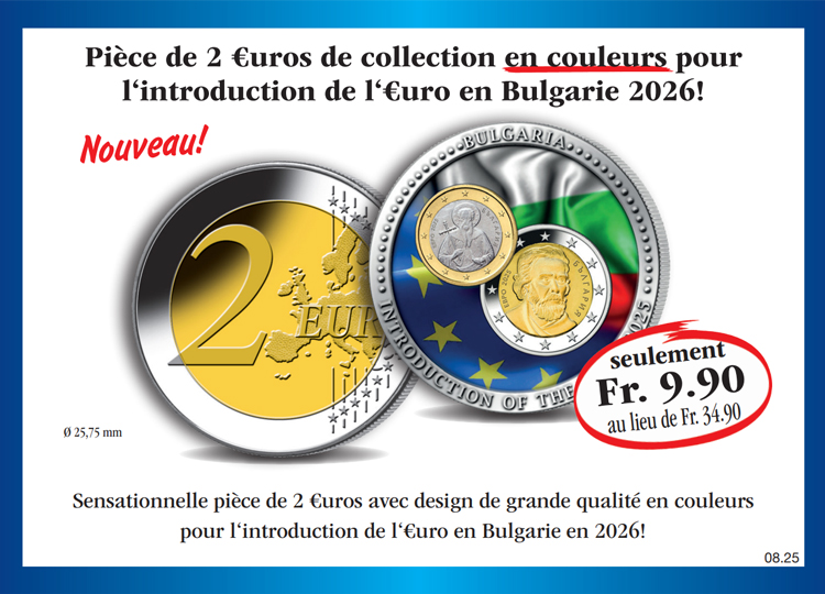 Panier Vous n'avez pas encore d'article dans votre panier. La pièce de collection de 2 euros en couleurs pour l'introduction de l'euro en Bulgarie en 2026! Procurez-vous dès aujourd'hui la pièce de collection de 2 euros avec affinage émail en couleurs pour l'introduction de l'euro en Bulgarie en 2026 au prix spécial de seulement Fr. 9.90 au lieu de Fr. 34.90 et, à rythme mensuel, une nouvelle émission de cette collection, à l'examen et sans obligation d'achat. Vous disposez à chaque livraison d'un droit de restitution de 15 jours! au lieu de Fr. 34.90 Fr. 9.90 TVA légale incluse Quantité: Participation aux frais d'envoi en sus (port, emballage, assurance) Ce produit ne peut être commandé que 5 fois par client. En cas de question, contactez notre service clientèle. Cela pourrait aussi vous intéresser!