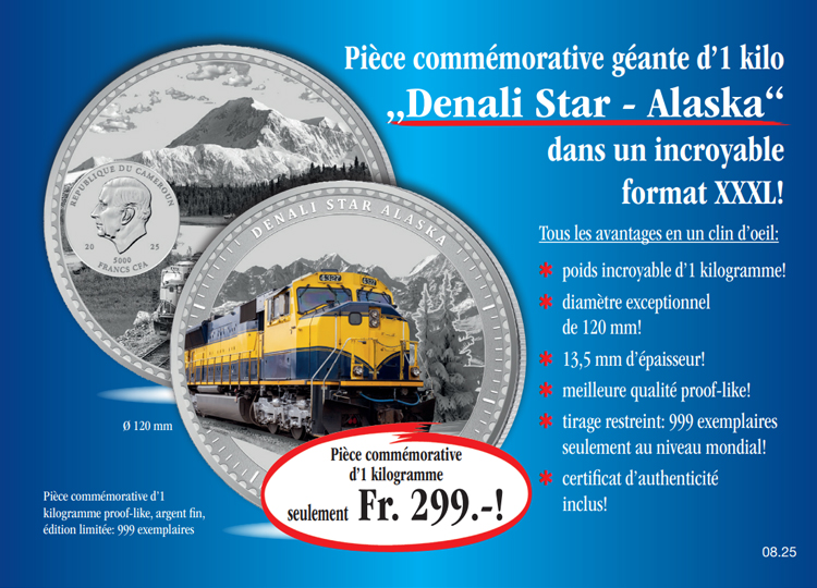 Panier Vous n'avez pas encore d'article dans votre panier. La pièce commémorative géante de 1 kilo „Denali Star – Alaska“ au format XXXL! Procurez-vous dès aujourd'hui la pièce commémorative géante de 1 kilo „Denali Star – Alaska“ au format XXXL (argentée et colorée, 120 mm, 13,5 mm d'épaisseur, tirage: 999 exemplaires) au prix spécial de seulement Fr. 299.-! Vous disposez à chaque livraison d'un droit de restitution de 15 jours! Fr. 299.00 TVA légale incluse Quantité: Participation aux frais d'envoi en sus (port, emballage, assurance) Ce produit ne peut être commandé que 3 fois par client. En cas de question, contactez notre service clientèle. Cela pourrait aussi vous intéresser!