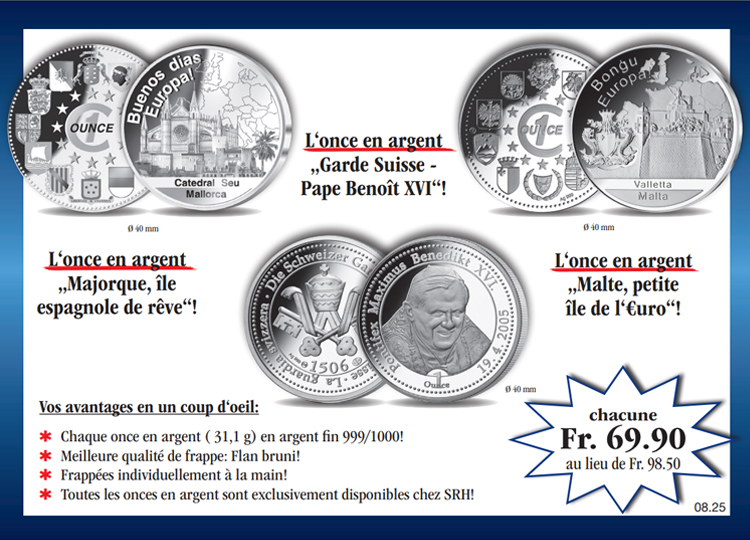Panier Vous n'avez pas encore d'article dans votre panier. L'once en argent „Majorque, île espagnole de rêve“ en Flan bruni! Procurez-vous dès aujourd'hui l'once en argent „Majorque, île espagnole de rêve“ en Flan bruni, la meilleure qualité de frappe (argent fin 999/1000, 31,1 g, 40 mm) au prix spécial de seulement Fr. 69.90 au lieu de Fr. 98.50 et, à rythme mensuel, une nouvelle émission de cette collection à l'examen et sans obligation d'achat. Vous disposez à chaque livraison d'un droit de restitution de 15 jours! au lieu de Fr. 98.50 Fr. 69.90 TVA légale incluse Quantité: Participation aux frais d'envoi en sus (port, emballage, assurance) Ce produit ne peut être commandé que 1 fois par client. En cas de question, contactez notre service clientèle. L'once en argent „Garde suisse – Pape Benoît XVI“ en Flan bruni! Procurez-vous dès aujourd'hui l'once en argent „Garde suissse - pape Benoît XVI“ en Flan bruni, la meilleure qualité de frappe (argent fin 999/1000, 31,1 g, 40 mm) au prix spécial de seulement Fr. 69.90 au lieu de Fr. 98.50 et, à rythme mensuel, une nouvelle émission de cette collection à l'examen et sans obligation d'achat. Vous disposez à chaque livraison d'un droit de restitution de 15 jours au lieu de Fr. 98.50 Fr. 69.90 TVA légale incluse Quantité: Participation aux frais d'envoi en sus (port, emballage, assurance) Ce produit ne peut être commandé que 1 fois par client. En cas de question, contactez notre service clientèle. L'once en argent „Malte – petite île de l'euro“ en Flan bruni! Procurez-vous dès aujourd'hui l'once en argent „Malte- petite île de l'euro“ en Flan bruni, la meilleure qualité de frappe (argent fin 999/1000, 31,1 g, 40 mm) au prix spécial de seulement Fr. 69.90 au lieu de Fr. 98.50 et, à rythme mensuel, une nouvelle émission de cette collection à l'examen et sans obligation d'achat. Vous disposez à chaque livraison d'un droit de restitution de 15 jours! au lieu de Fr. 98.50 Fr. 69.90 TVA légale incluse Quantité: Participation aux frais d'envoi en sus (port, emballage, assurance) Ce produit ne peut être commandé que 1 fois par client. En cas de question, contactez notre service clientèle.