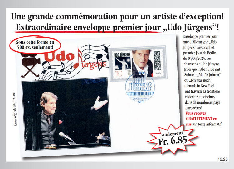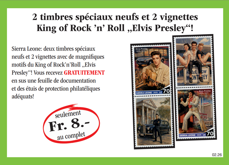 Panier Vous n'avez pas encore d'article dans votre panier. Les timbres spéciaux et vignettes neufs du King of Rock'n Roll „Elvis Presley“! Procurez-vous dès aujourd'hui les deux timbres spéciaux et 2 vignettes neufs du King of Rock'n Roll „Elvis Presley“ au prix spécial de seulement Fr. 8.-! Gratuits en sus: le texte de documentation adéquat et l'étui de protection philatélique! Vous recevez à rythme mensuel des nouvelles émissions de cette collection, à l'examen et sans obligation d'achat. Vous disposez à chaque livraison d'un droit de restitution de 15 jours! Fr. 8.00 TVA légale incluse Quantité: Participation aux frais d'envoi en sus (port, emballage, assurance) Ce produit ne peut être commandé que 5 fois par client. En cas de question, contactez notre service clientèle. Cela pourrait aussi vous intéresser!