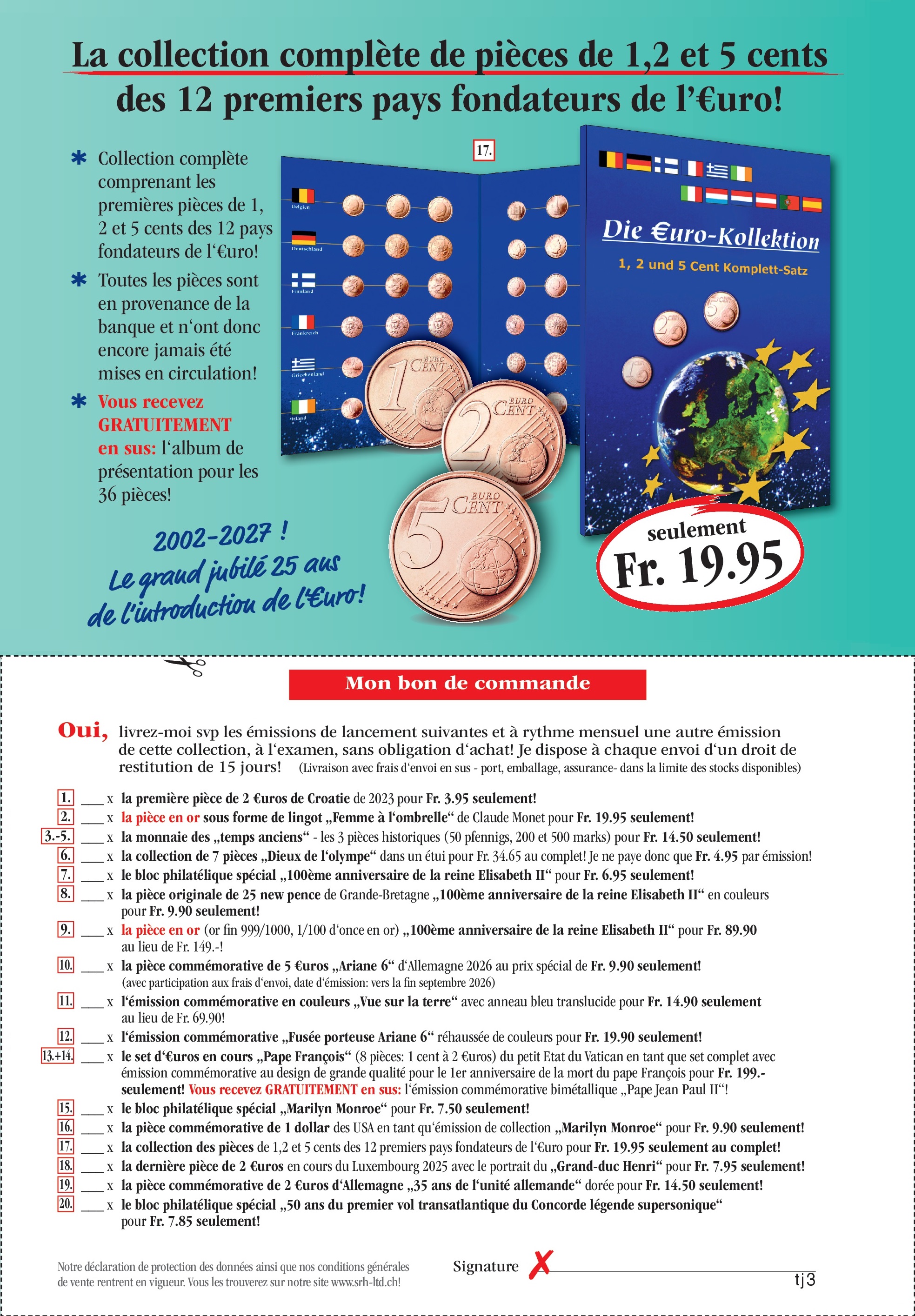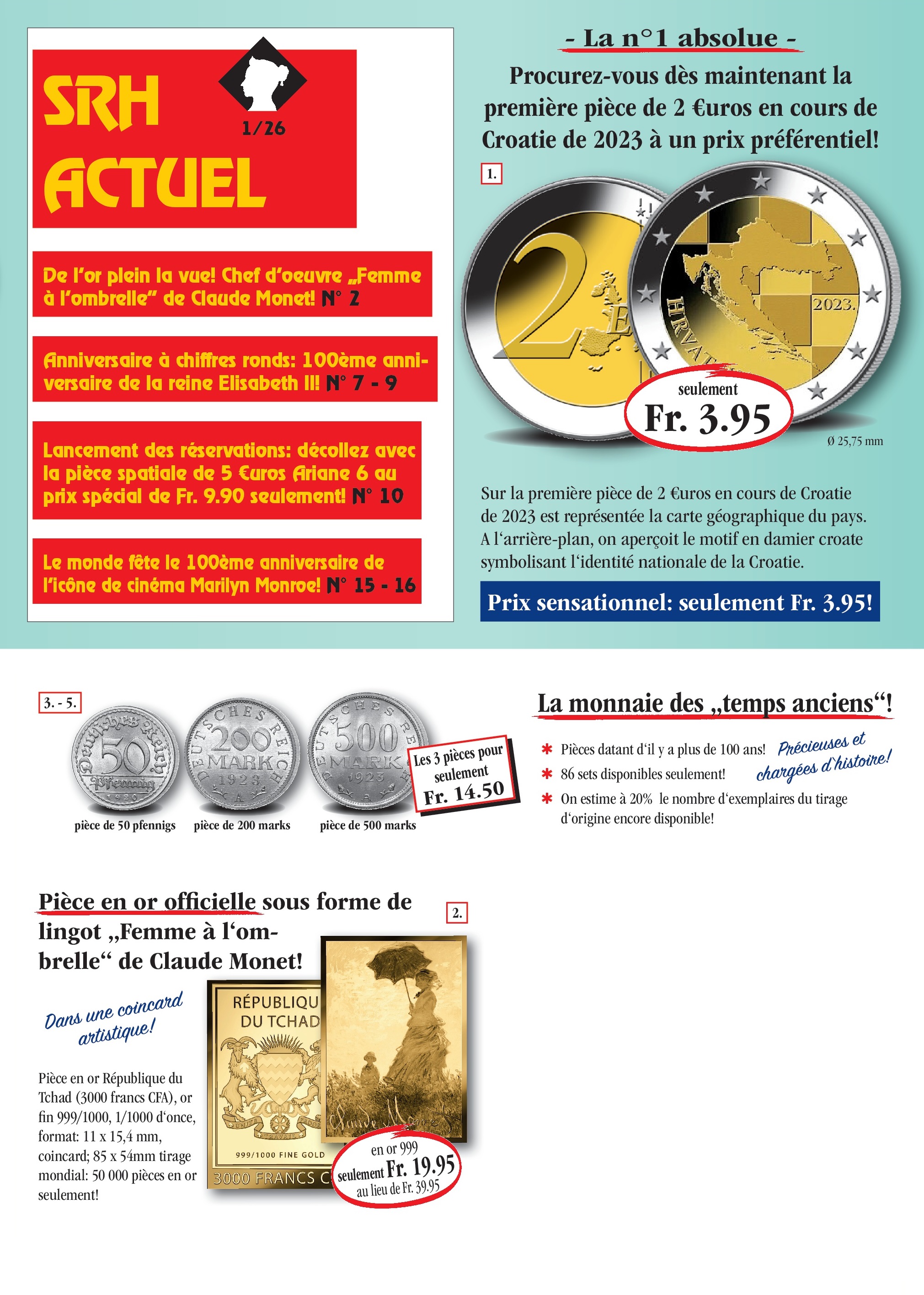 Garantie-confiance/droit de résiliation: vous pouvez naturellement résilier votre abonnement dans les 15 jours suivants la commande. Une information ou un retour de marchandise adressé à Sir Rowland Hill AG, Schützenmattstrasse 46, 8180 Bülach ZH suffit. Tous frais occasionnés par un renvoi d'article est à votre charge. Nos conditions générales de vente s'appliquent et peuvent être consultées sur www.srh-ltd.ch. Vous pouvez également nous le demander par écrit. Protection des données: vos données personnelles seront traitées confidentiellement et seulement par SRH à des fins publicitaires. Une résiliation est à tout moment possible par courrier ou par courriel à confidentialite@srh-ltd.ch.
